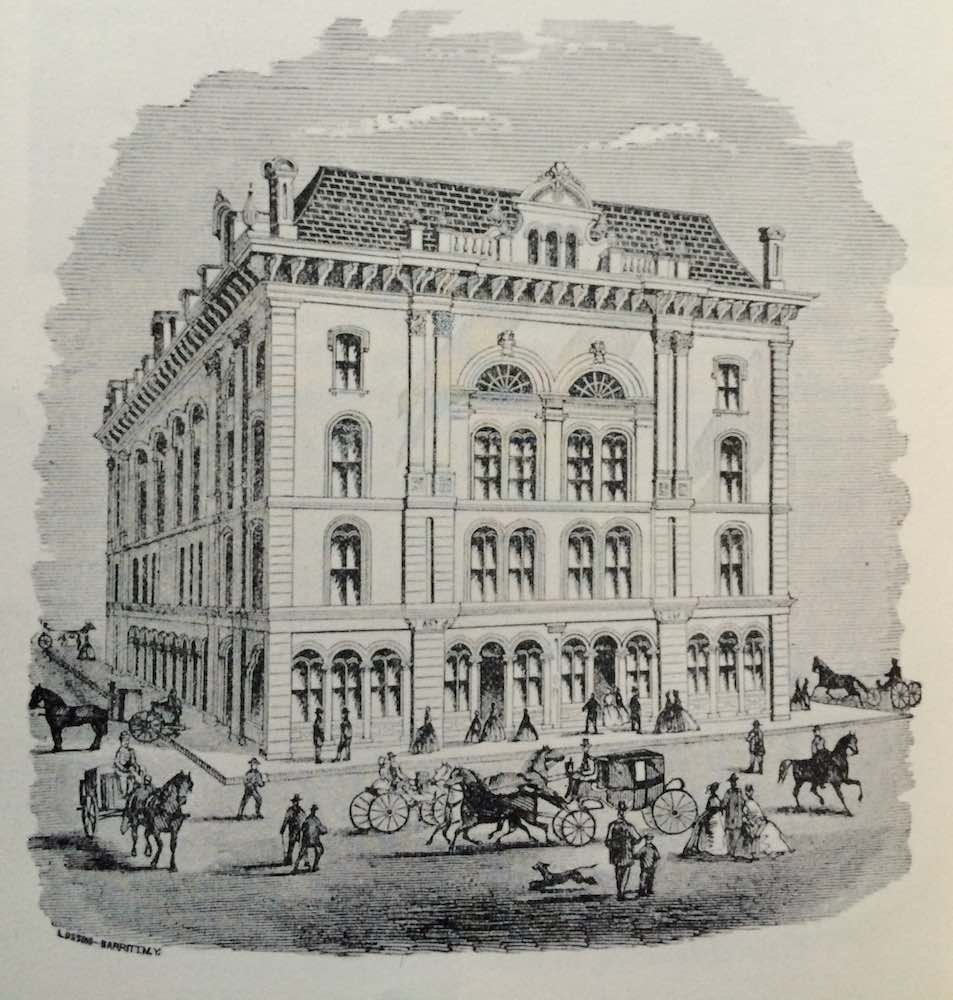 Case Hall was completed in 1865. When the Ark's frame house was torn down in 1875 to build a new federal building on the northeast side of Public Square, the Arkites moved next door to Case Hall. It stood until 1902 when it too was demolished (along with the federal building) to construct a new Post Office as part of the Group Plan. | Source: William Payne, Cleveland Illustrated (Cleveland: Fairbanks and Benedict, 1876)Download Original File