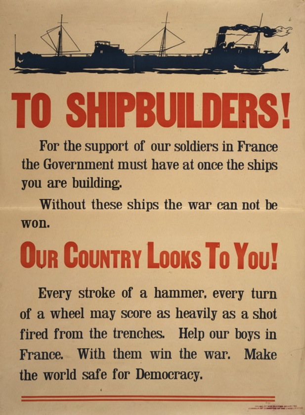 The War Shipping Committee, also know as the Emergency Fleet Corporation (later renamed the U.S. Shipping Board Merchant Fleet Corporation), was created shortly after America declared war to procure a much-needed mercantile fleet. One of the first acts of the Emergency Fleet Corporation was to commandeer nearly 400 steel ships contracted for construction or being built at American boatyards. | Source: United States Library of Congress Prints and Photographs DivisionDownload Original File