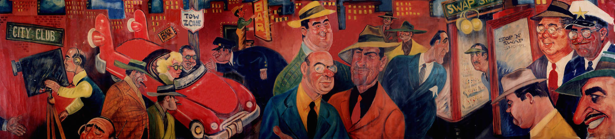 This original full-size mural by Cleveland Press artist Bill Roberts once hung at Kornman's restaurant in Short Vincent and the Press Club of Cleveland before it was donated to the Western Reserve Historical Society. The reproduction, photographed by Tim Ryan, was now on display at Nighttown restaurant in Cleveland Heights, Ohio, "home" of the Press Club of Cleveland. | Creator: Bill Roberts; Tim Ryan | Source: Cleveland Memory, Michael Schwartz Library Special Collections at Cleveland State UniversityDownload Original File
