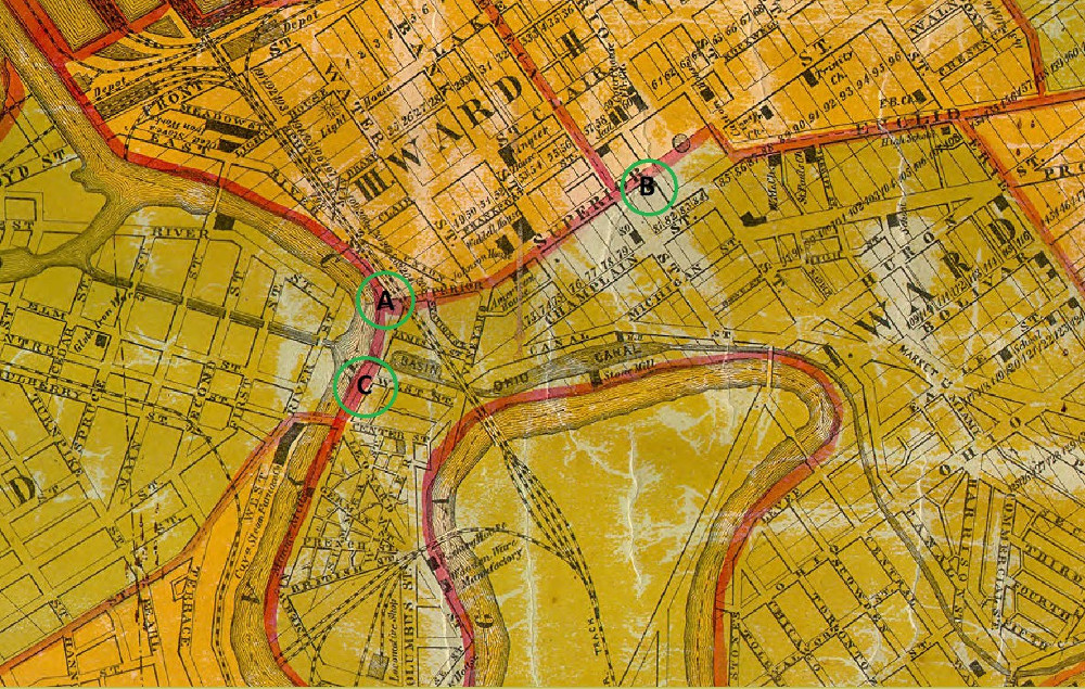 This 1858 Cuyahoga County Map illustrates a section of downtown Cleveland in that year. The green circles denote the locations of Alexander Kimberley's three saloons that produced enough income to enable him to achieve middle class status and build the house at 7403 Denison in 1866. (A) marks the location of his first saloon in 1852; (B) his second one on the Square in 1855; and (C) his third one on Merwin Street in Gravity Place. | Source: Cleveland Public Library, Digital Maps CollectionDownload Original File