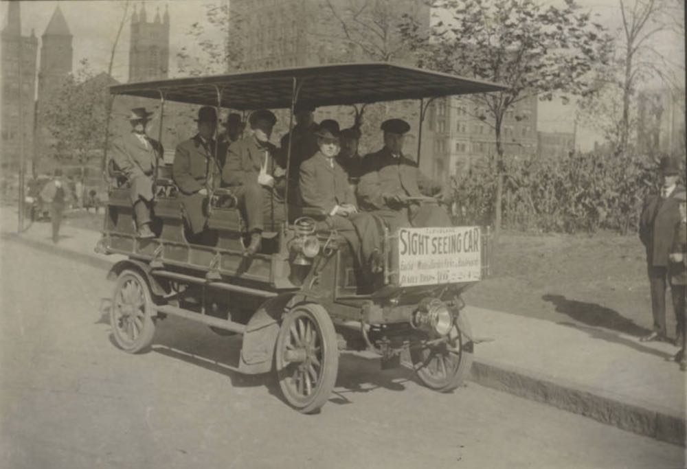 By the early 20th century Public Square, which was centrally located and close to the city's main hotels, served as the point of departure for tourist sightseeing cars such as this one. So-called "seeing-the-city cars," as historian Catherine Cocks has argued, were also very popular means of enabling tourists to selectively view cities as collections of attractions. | Date: 1910 | Source: Cleveland Public Library Digital GalleryDownload Original File