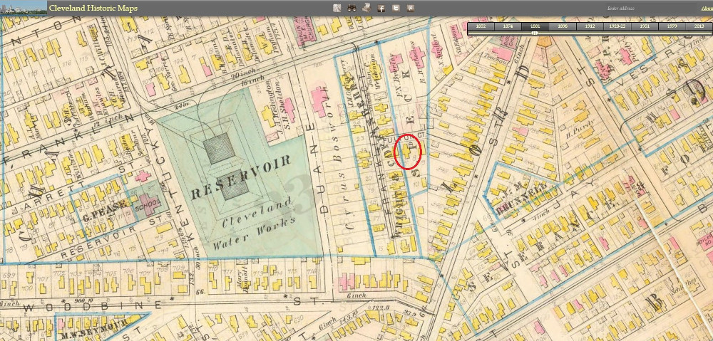 The above section of the 1881 Hopkins Cleveland Atlas shows that the house in which Admiral Isaac Kidd was born in 1884 was in existence at least three years earlier. Cuyahoga County Tax Duplicates suggest a build date of 1875 or 1876. The house was situated not far from some of the grand mansions built on Franklin Boulevard in the mid to late nineteenth century. | Source: Cleveland Public Library, Digital Map CollectionDownload Original File