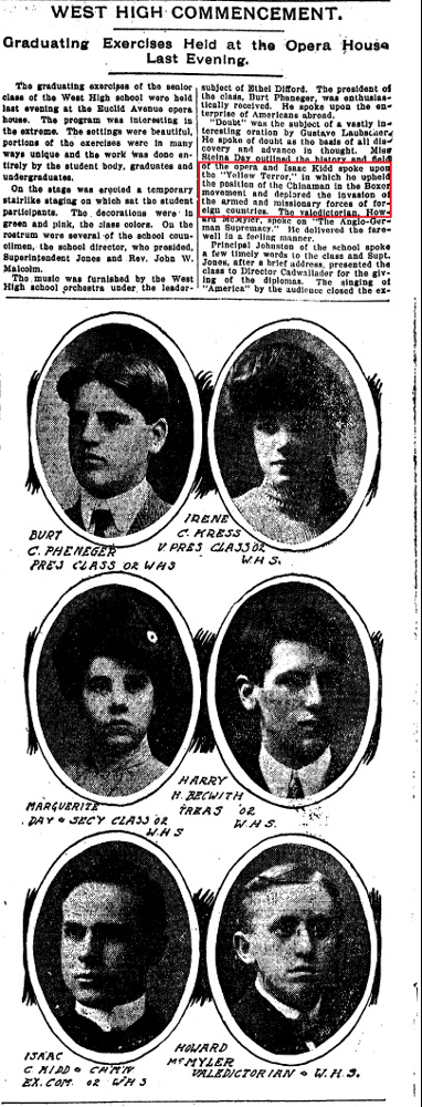 Isaac Campbell Kidd grew up on Cleveland's west side and attended Cleveland public schools, including West High School from which he graduated in 1902. Commencement was held, as this article from the June 18, 1902, edition of the Plain Dealer indicates, in the Euclid Opera House on East 4th Street. There, Kidd delivered an address on "The Yellow Peril," which nearly forty years later took on an eerie and tragic irony. | Source: Cleveland State University, Michael Schwartz Library, Special Collections.Download Original File