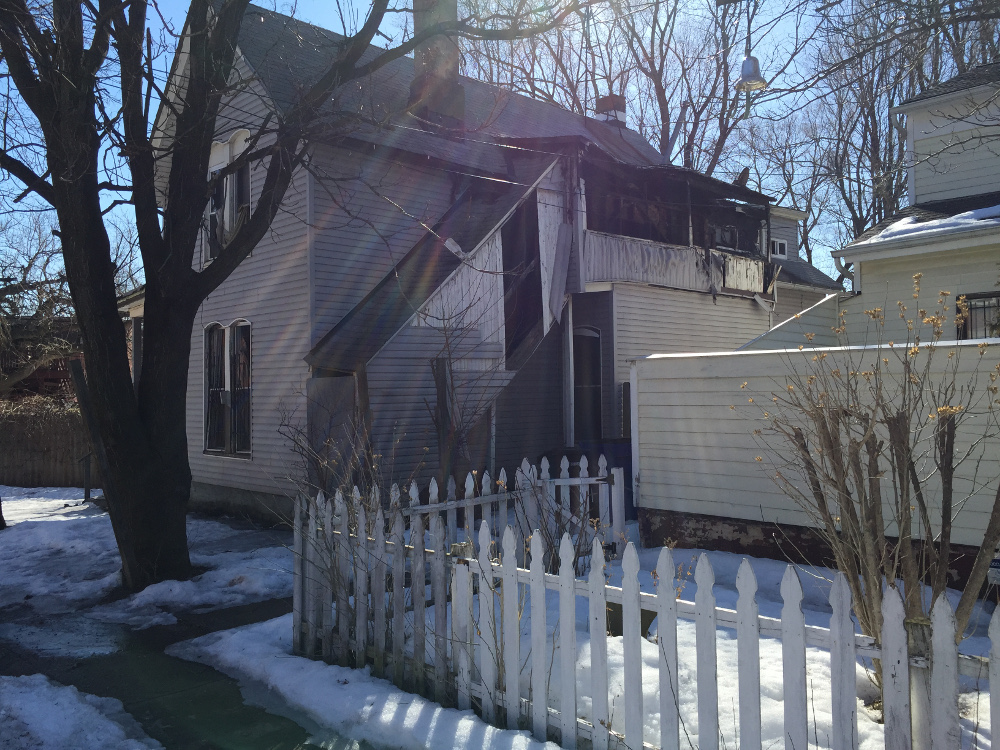 In the winter of 2014-2015, a fire occurred in the house at 3059 Mabel Court, the birthplace of Admiral Isaac Kidd. As shown in this March 2015 photo, extensive damage was done to the second floor of the structure. The house was condemned and later demolished in April 2015. | Source: Jim DubelkoDownload Original File