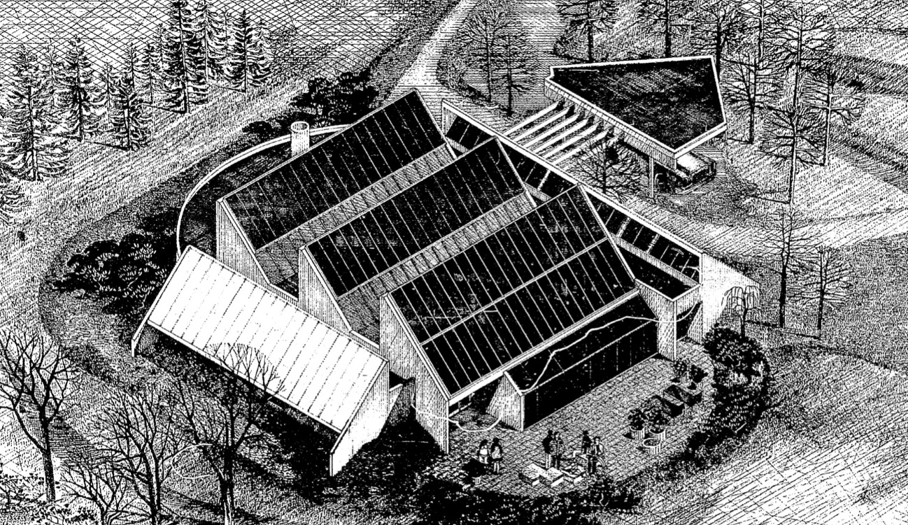 The energy efficient home displayed at the 1976 Home and Flower Show was designed by Neil William Guda. Solar collectors on three sections of the roof provided heat for the home. As the sun heated water circulating in tubes under the plastic surface of the solar panel, the warm water flowed to a heat storage tank in the adjoining greenhouse. | Source: The Cleveland Plain DealerDownload Original File