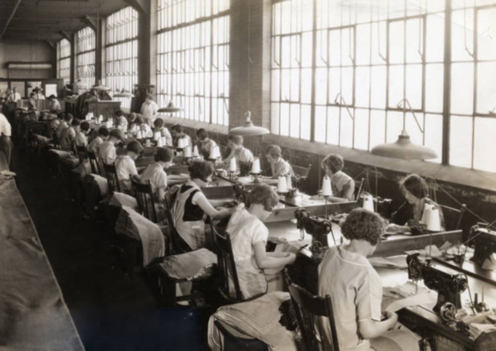Uncommon for the American garment industry of the early twentieth century was the open-air, welcoming interior accommodations of the Richman Brothers factory. Compared to the dank, dirty and unsafe working conditions present in most sweatshops in places like New York City, the Richman Brothers Company was a pioneer in its treatment of employees. | Date: April 8, 1928 | Source: Cleveland Memory Project, Cleveland State University Library Special CollectionsDownload Original File