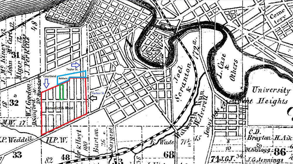 This part of the 1852 Blackmore Map of Cuyahoga County shows the street configuration of the Benedict and Root Subdivision in Ohio City which was approved for development in that same year. Two years later, Ohio City was annexed to the City of Cleveland. The subdivision boundaries are marked in red; the future Dudley Baldwin subdivision in blue; and Birch (later West 50th) Street, between Franklin and Bridge, in green. | Creator: Cleveland Historic MapsDownload Original File