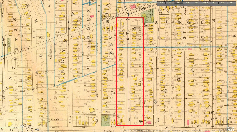 This part of the 1881 Hopkins' Atlas of Cleveland shows the status in that year of housing development on Birch (West 50th) Street (between Franklin and Bridge) which, at the time this map was drawn, was almost thirty years under way. Noticeable on the map, in addition to the number of then as yet undeveloped lots, are the number of lots splits in the Benedict and Root part of Birch Street. The developers of this subdivision had in 1852 platted sixty foot wide lots; however, as sales of lots proceeded, they found that their working class buyers often preferred to "split" the lots, building a home for themselves and their families on one half, and generating profit by selling the other half, either with or without a house on it. Learning from this, developer Dudley Baldwin, whose adjoining subdivision was platted in 1863, created 30-foot wide lots in his development. (See lots on Birch Street above the blue line on the map.) | Creator: Cleveland Historic MapsDownload Original File