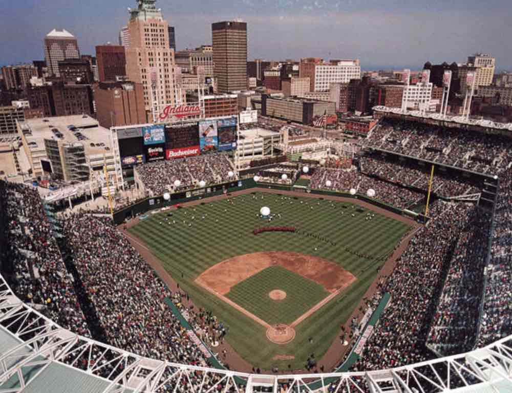 President Bill Clinton threw the opening pitch before the first Indians game at Jacobs Field on April 4, 1994. Jacobs Field drew unprecedented attendance to Indians games. In fact, the Indians sold out 455 straight games. | Creator: SkyView Aerial Photography, Inc. | Date: April 4, 1994 | Source: Cleveland Memory Project, Cleveland State University Library Special CollectionsDownload Original File