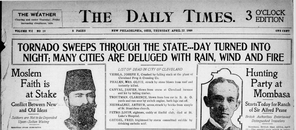 According to the Weather Bureau, this was the heaviest wind and most devastating storm Cleveland had experienced up to that time. In the end 6 people died, over 50 were injured, the city was left without power, and debris littered the streets. Twelve churches, seventeen schools, and over 300 homes were damaged. | Date: 1909 | Source: The Daily Times (New Philadelphia, OH)Download Original File