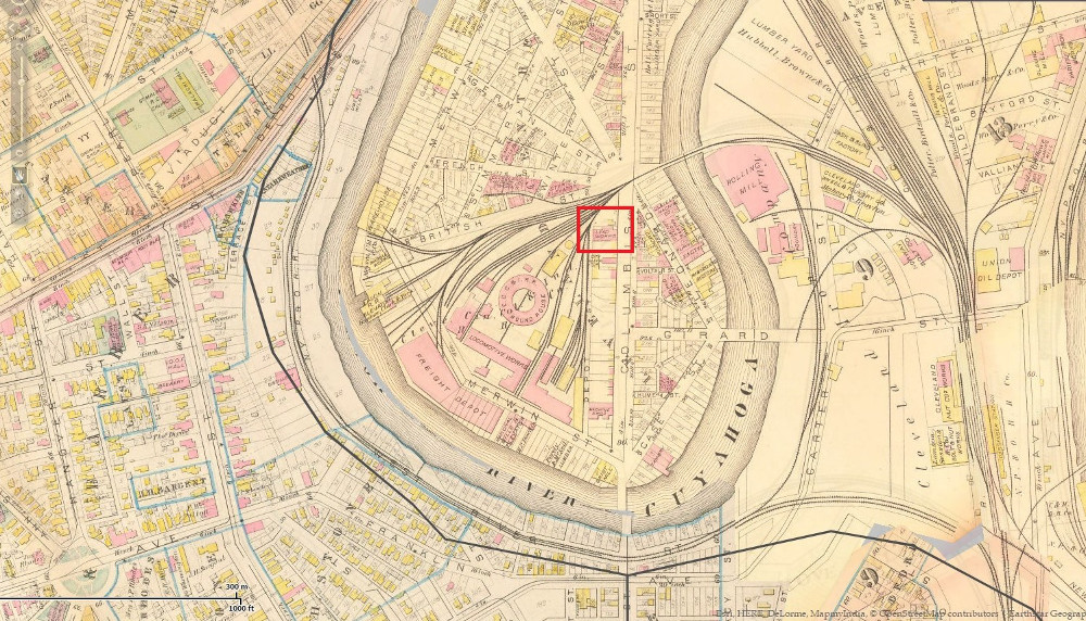 This page of the Hopkins 1881 City Atlas of Cleveland shows the location (red box) of the lead works founded by Samuel Gibson, W. J. Roberts and W. A. Price in the mid-1870s. The factory was located in an area of the Flats that was at one time called "Cleveland Centre"--planned as a place for businesses engaged in international trade, as the names of nearby streets attest. In the lower left hand corner of the map, you can see a portion of Franklin Circle. The factory was located only a mile and a half or so from W. J. Roberts' home on Franklin Boulevard. | Source: Cleveland Public Library Digital Map Collection