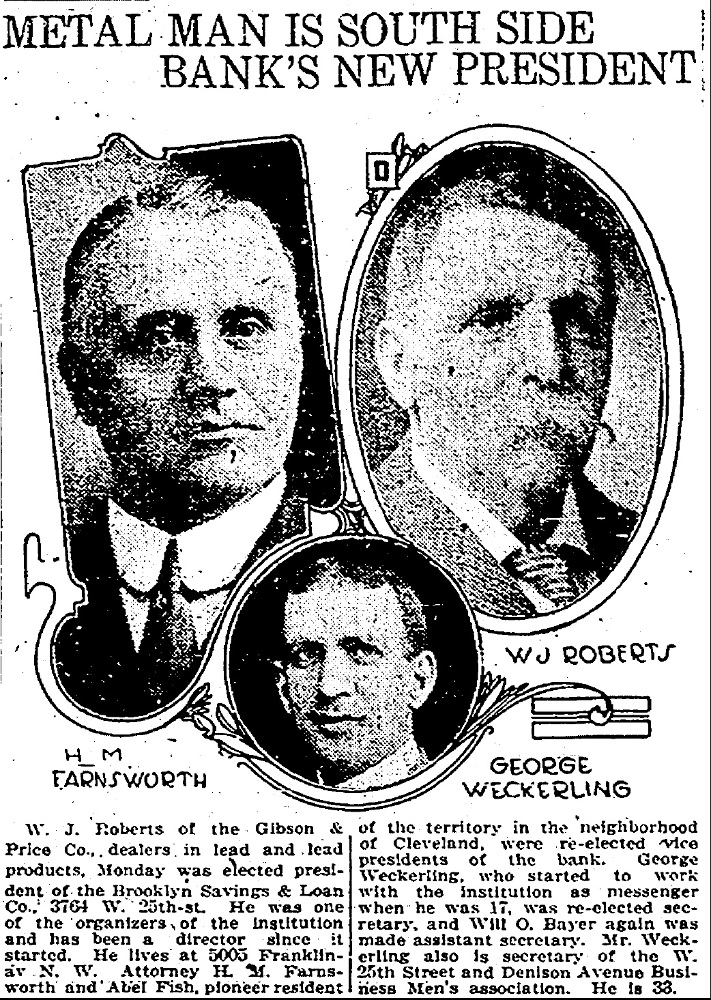 That is how the Plain Dealer on January 15, 1914 announced that W. J. Roberts of the Gibson and Price Lead Works had become the new President of Brooklyn Savings & Loan Association. It was quite possibly Roberts' last business hurrah. He died 5 years later in 1919. | Source: Cleveland State University, Michael Schwartz Library, Special CollectionsDownload Original File