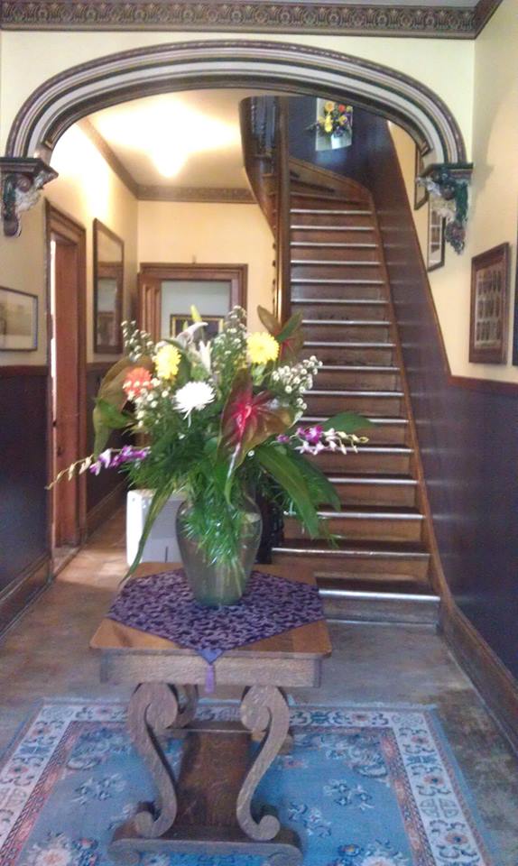 Immediately inside the front door is the main foyer. The winding staircase leading to the second floor is anchored on either side by the dining room and parlor. Both spaces retain their original, matching carved fireplace mantles and are currently used as meeting spaces and offices by the Slovenian National Home. | Source: Slovenian National HomeDownload Original File