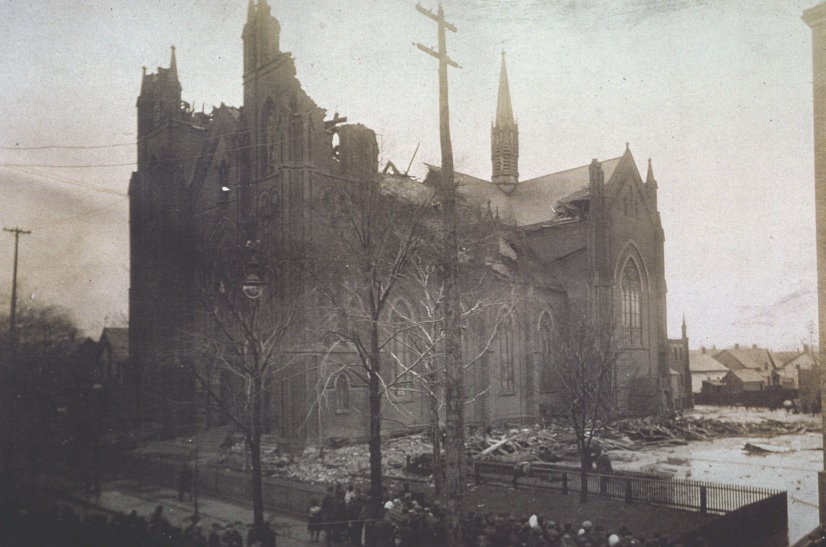 This photo shows the damage to St. Stan's after the 1909 storm. While the steeples sustained the most damage, the interior of the church was destroyed by the falling debris. It is also noteworthy that none of the surrounding buildings are damaged, demonstrating the sporadic nature of the storm. | Source: Photo Courtesy of Glen SobolaDownload Original File