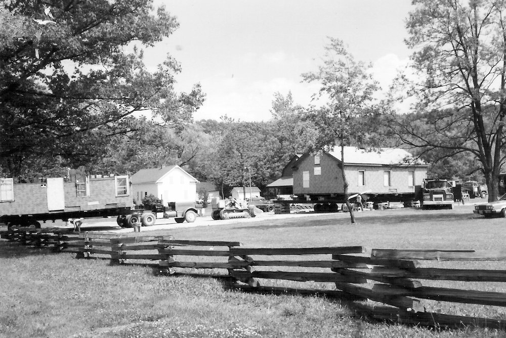 The Carpenter House was moved to Frostville in May of 1987. Purchased by Forest Kitson in 1946, the home on Lorain Road was soon surround by an emerging business district. When the Kitson family decided to sell their property in 1985, the home was donated to the Olmsted Historical Society. After over a year of unsuccessful attempts by the historical society to solicit funds for relocating the structure, it appeared that the Carpenter House was doomed. In 1987, the George Gund Foundation presented the organization with a $15,000 grant to help pay for the move. While only needing to travel two miles, the house had to be split horizontally into halves to avoid collisions with overhead wires and trees along the route. The top and bottom sections weighed 30 and 40 tons, respectively. | Source: Image courtesy of Olmsted Historical SocietyDownload Original File