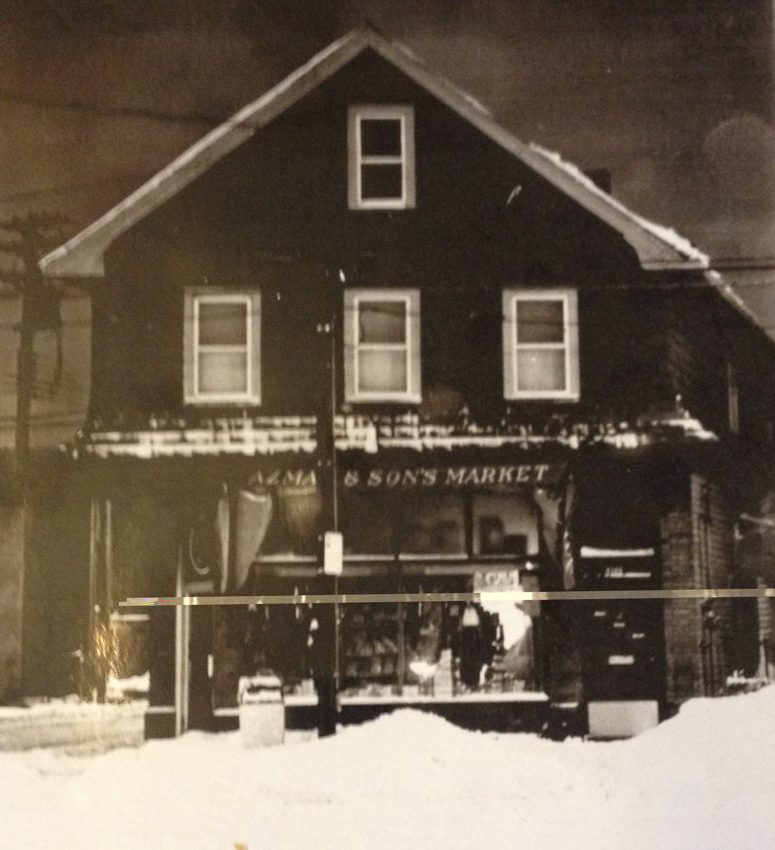Azman & Sons Market Exterior. ID: 7456 | This file appears in: Azman & Sons Market This undated photograph of Azman & Sons Market shows the front view of the home which still retains the Azman & Sons Market awning cover shown above the first floor window today. | Source: Frank Azman Download Original File SourceFrank Azman "Azman & Sons Market Exterior. " appears in: Azman & Sons Market