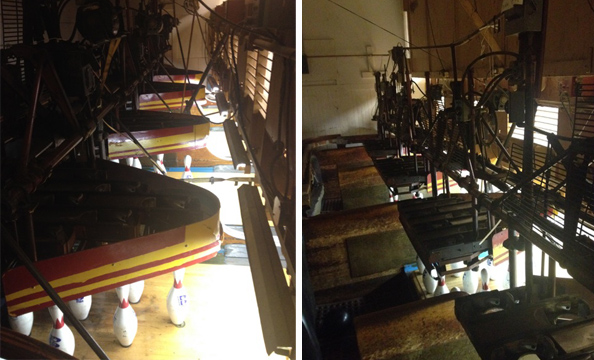 One unique element of Maple Lanes Bowling Alley is the semi-automatic pin setting machines. Young members of the Abranovich family begin their careers as pin setters spending shifts working with this perspective of the alley. | Source: Joe DillDownload Original File