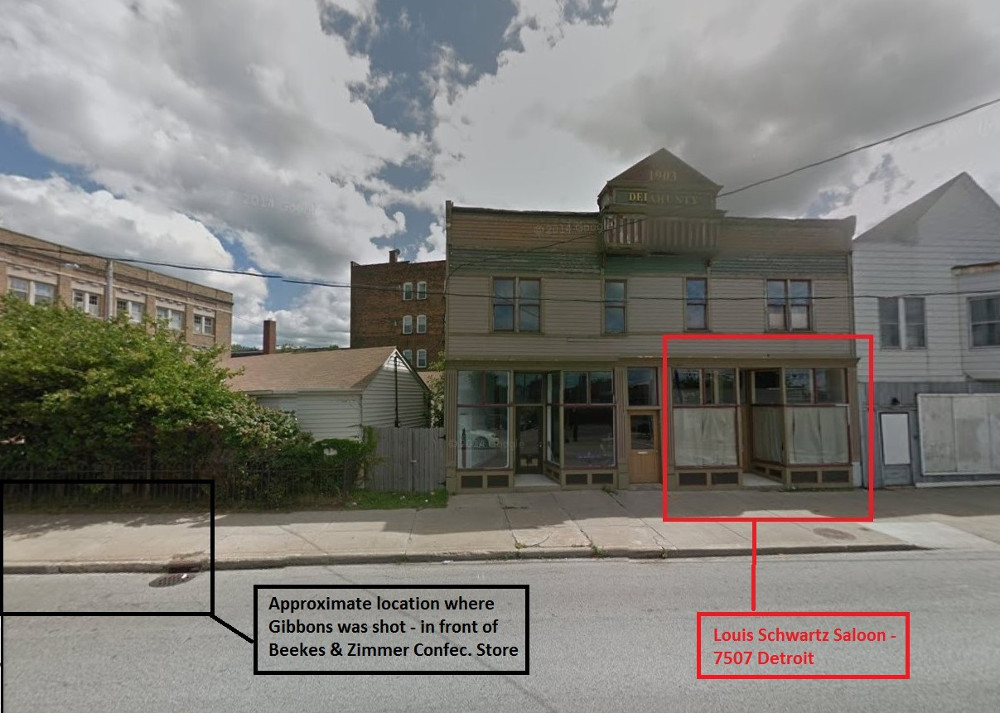 According to most of the witnesses who testified at the Harvey Callahan murder trial in January 1915, the shooting of Thomas Gibbons took place near Beekes & Zimmer confectionary store at 7503 Detroit Avenue. While the building that housed that retail shop no longer exists, the building immediately to the west still does. That building, which housed Louis Schwartz' saloon, was where two car loads of "toughs," allegedly assembled by William "Scance" Chambers and another Plain Dealer distributor, drank, while waiting for the Leader Delivery truck holding Harvey Callahan and Frank O'Neill to arrive. | Creator: Google MapsDownload Original File