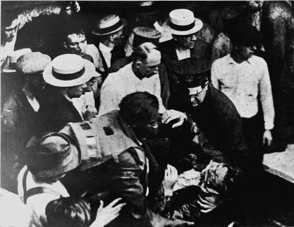 This photograph, which first appeared in the Cleveland News on July 25, 1916, shows Garrett Morgan helping one of the rescuers that he rescued from the west side waterworks tunnel. This was one of only a few articles or photographs appearing in Cleveland newspapers following the tunnel disaster that gave any credit to Morgan, an African American, for his inventiveness and bravery on July 25. | Creator: Cleveland News | Date: 25 July 1916 | Source: Cleveland State University, Michael Schwartz Library, Special CollectionsDownload Original File