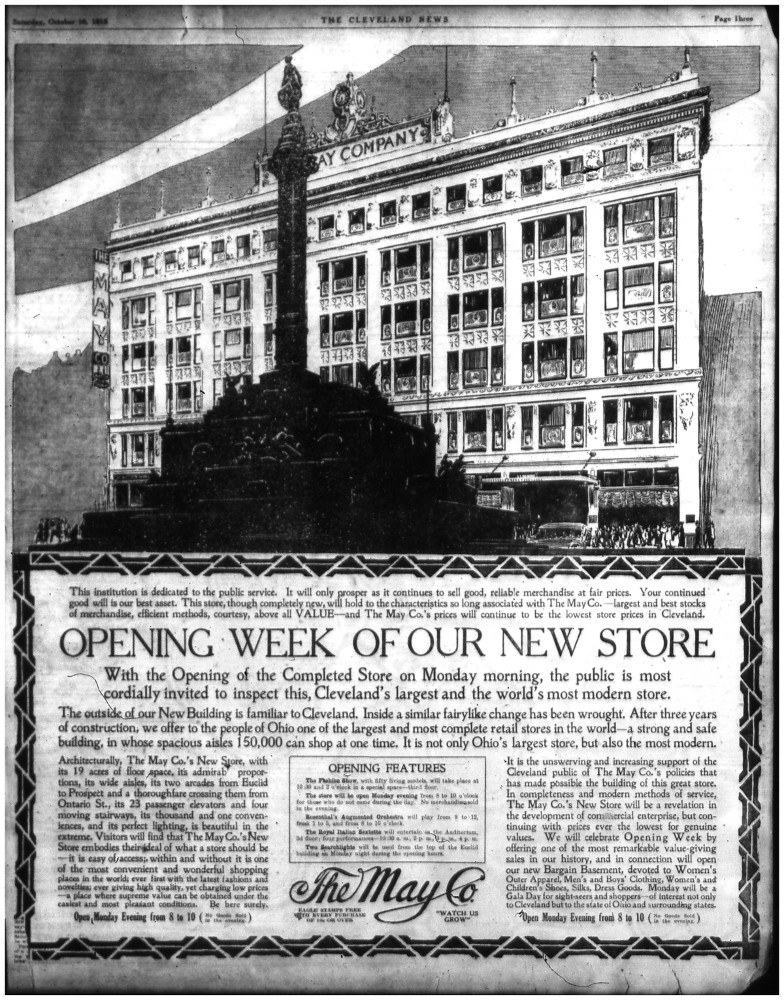 That was how The May Co. officials touted their new department store in downtown Cleveland. They also took pains—and some artistic licenseas can be seen in this advertisement which appeared in the Cleveland News on October 15, 1915—to make sure that shoppers knew its location across Euclid Avenue from a very familiar city monument. | Source: Cleveland NewsDownload Original File