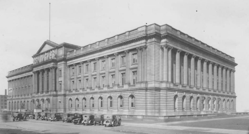 The beaux-arts style courthouse was created by the architecture firm of Lehman-Schmitt beginning in 1906 as part of Cleveland's Group Plan. Theodore Schmitt, Turnverein member, was one of Cleveland's most famous architects. | Date: 1916 | Source: Photograph Collection, Cleveland Public LibraryDownload Original File