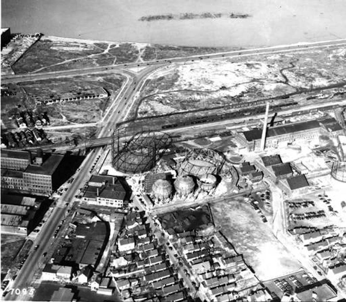 Two of the four cylindrical tanks are on display as the construction of the factory continued. It was ultimately the fourth tank that proved to be faulty and create the fire that followed. | Source: Cleveland Press Collection, Cleveland State University Library Special Collections