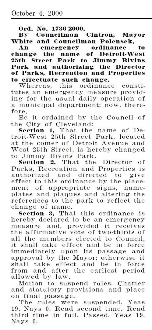 On October 4, 2000, Cleveland City Council adopted Ordinance No. 1736-2000, sponsored by near west side Councilman Nelson Citron. The legislation named the park on the corner of Detroit Avenue and West 25th Street, "Jimmy Bivins Park," in honor of Bivin's great boxing career and subsequent service to the youth of Cleveland's near west side as a trainer and gym owner. | Source: Cleveland Public Library, Administration Branch, City RecordDownload Original File