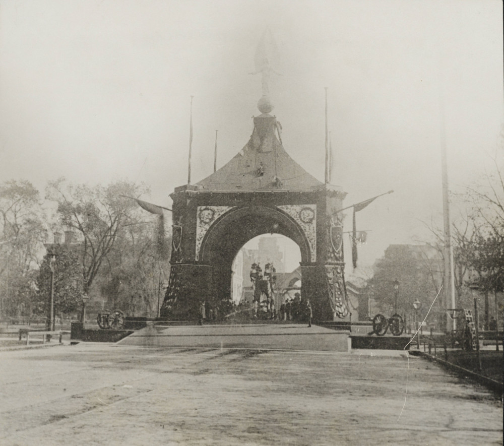 This monument was designed by the architectural firm of Coburn and Barnum as a resting place for the body of President James Garfield while it lay in state at the center of Public Square from September 24-26, 1881. The photo was taken on Superior Avenue, facing east. The selection of Forrest Coburn's firm to design this important, if temporary, memorial to President Garfield is evidence that, just three years after its founding, the firm of Coburn and Barnum was among the most prestigious architectural firms in Cleveland. | Source: Cleveland Public Libary, Digital Photo CollectionDownload Original File