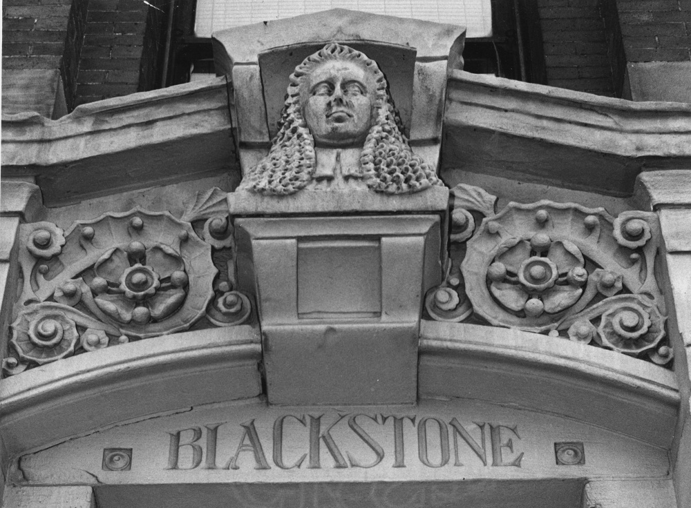 All entering the Blackstone Building at its main entrance on Seneca (West 3rd) Street, walked under this bust of William Blackstone, the famous eighteenth century English jurist. The stone bust and entrance way was designed by John H. Edelman, a young architect in the offices of Coburn and Barnum. Edelman later moved to Chicago, and there mentored Louis Sullivan, who became known as the father of the American Skyscraper. This photo was taken in 1960 shortly before the building was razed. | Source: Cleveland Public Library, Digital Photograph CollectionDownload Original File