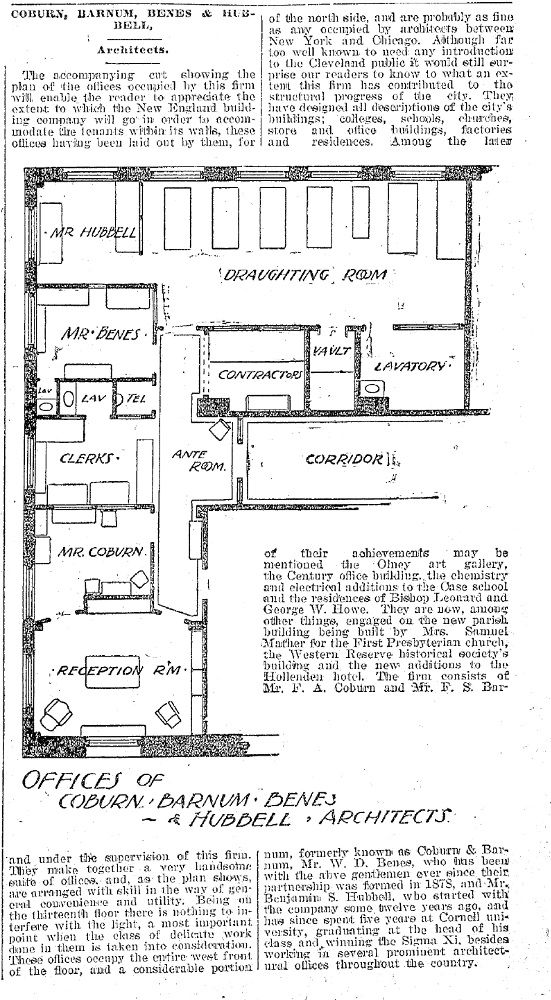 In the year 1896, the firm of Coburn and Barnum expanded, taking on two new partners, long-time employee, W. Dominick Benes, and Walter Hubbell. The new firm moved that year from the Blackstone Building in what today is the Warehouse District to the recently-built New England Building on the north side of Euclid Avenue, just east of Bond (East 6th) Street. In the same year, Forrest Coburn's elderly mother was involved in a serious trolley car accident, which led to acrimonious litigation. Also that year, the firm undertook a number of new projects, including designing a new building for the Western Reserve Historical Society. And, according to his obituary, Coburn was visibly upset over delays in completion of renovations he designed for the First Congregational Church on Franklin Avenue--his own church. Perhaps it was all to much for Coburn, who never even reached his 50th birthday. He died in December 1897, according to the newspapers of the time, from "overwork." (The article above appeared in the Cleveland Plain Dealer edition of April 23, 1896.) | Source: Cleveland State University, Michael Schwartz Library, Special CollectionsDownload Original File