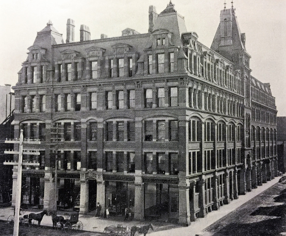 When the ornate five story building named for the famous eighteenth century English jurist went up in 1881, on the southwest corner of Seneca (West 3rd) and Frankfort Streets--just a block away from the Cuyahoga County courthouse, it seemed a natural location for law offices. And it was. The building was known mostly as a lawyers' building, but other professions--including architects, also chose it for their offices. Coburn and Barnum, the architects who designed the building for owner Jacob Perkins, moved their offices to the building in 1883, and stayed there until 1896. The Blackstone Building was said by one architectural historian to be a leading example of the work product of the new generation of Cleveland architects in the post Civil War era who produced some of downtown Cleveland's grandest late nineteenth century buildings. This photo was taken in circa 1897. The building was razed in the early 1960s. | Source: Western Reserve Historical SocietyDownload Original File