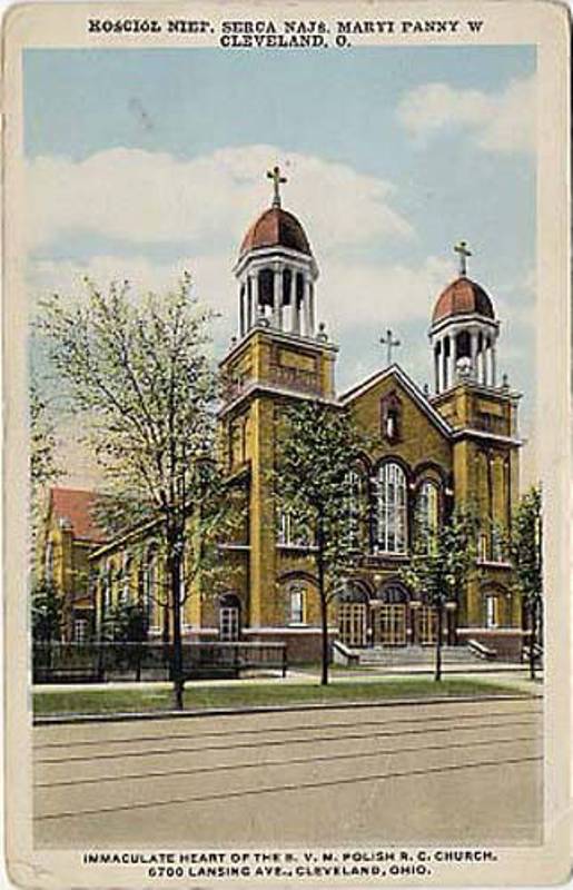 Postcard showing the front of the Immaculate Heart of Mary Church. The church was organized for the purpose of giving the Polish community of Warszawa an independent Polish-American church. | Source: Cleveland Memory Project, Cleveland State University Library Special CollectionsDownload Original File