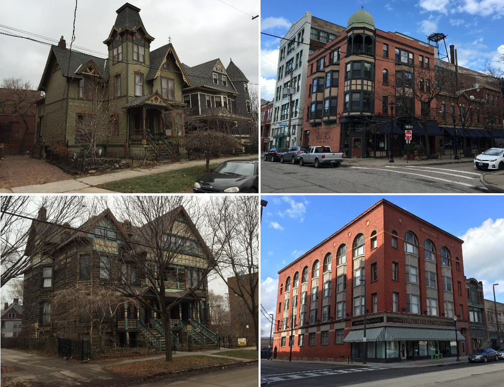 Forrest Coburn was a long-time resident of Cleveland's west side. His firm designed a number of houses, churches and commercial buildings that are still standing in Ohio City and the Franklin-West Clinton Historic District. Among them are the four here which were photographed in 2016. The two houses to the left are (top) the Spitzer House at 2830 Franklin Boulevard, designed in 1879, and (bottom) the Sara Bousfield House at 3806 Franklin Boulevard, designed in 1873--today Stone Gables Bed & Breakfast. The two commercial buildings to the right are (top) the Hermann Block at 2526 Market Avenue, designed in 1889--today part of the Great Lakes Brewing Company complex, and the Merrill Block at 1900 West 25th Street, designed in 1893--today occupied by Third Federal Savings and Loan Association. | Creator: Jim DubelkoDownload Original File