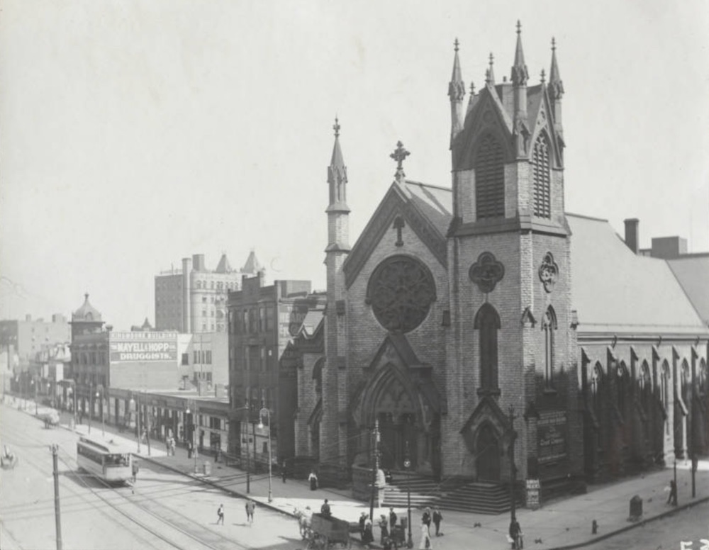 The church, erected in 1874, appears here just before its demolition in 1905 to build the Cleveland Trust Company Building. The congregation moved to a large, new Gothic edifice at Euclid and East 30th that same year. Note that this section of Euclid Avenue's famed "Millionaires' Row" had completely transformed into part of city's central business district by this time. | Creator: Livingston Fewsmith | Date: 1904 | Source: Cleveland Public Library Digital Gallery Download Original File