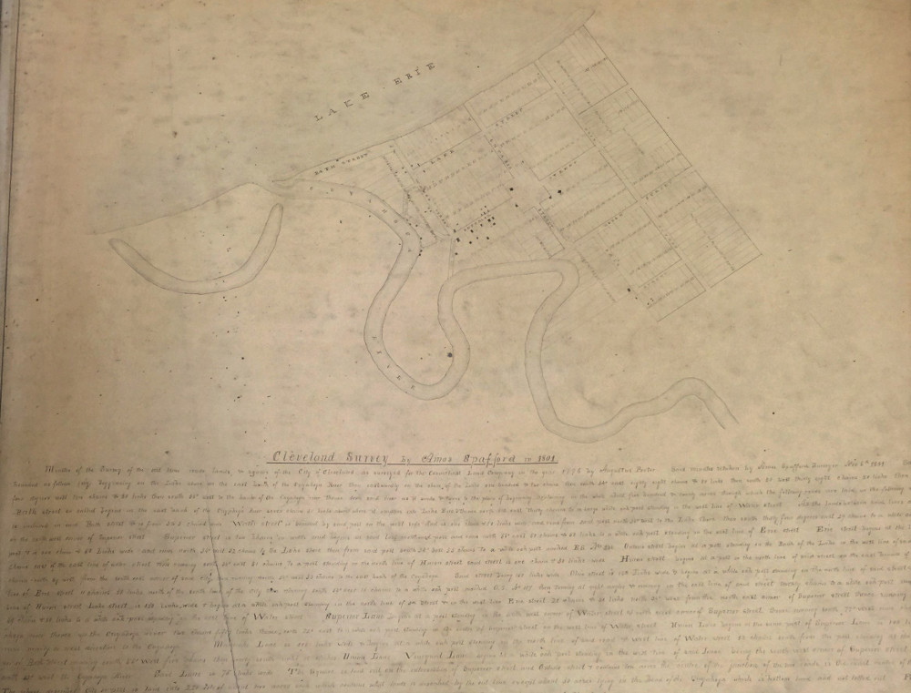 This plat map was drawn by Amos Spafford, a Connecticut Land Company surveyor, in 1801. It accurately shows that, while in this year there was village development on the east bank of the Cuyahoga River, there was none on the west bank. | Source: Cuyahoga County ArchivesDownload Original File