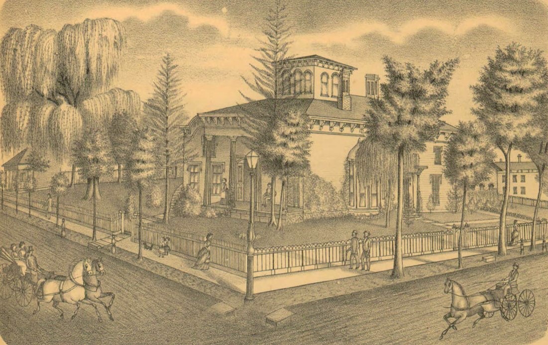 In West Village, the grandest homes were located on Washington Avenue. The house in this sketch which appeared in the 1874 Cuyahoga County Atlas was built in 1836 for Charles Winslow, a Buffalo Company investor. This was the same year that West Village became part of Ohio City. After Winslow's death, it became the house of his son-in-law C. L. Russell, who led the Ohio City forces in the 1836 Battle of the Bridge. The house was razed in 1912, to make room for Bulkley Boulevard, the precursor roadway to the west Memorial Shoreway. | Source: Cleveland Public Library, Digital Map CollectionDownload Original File