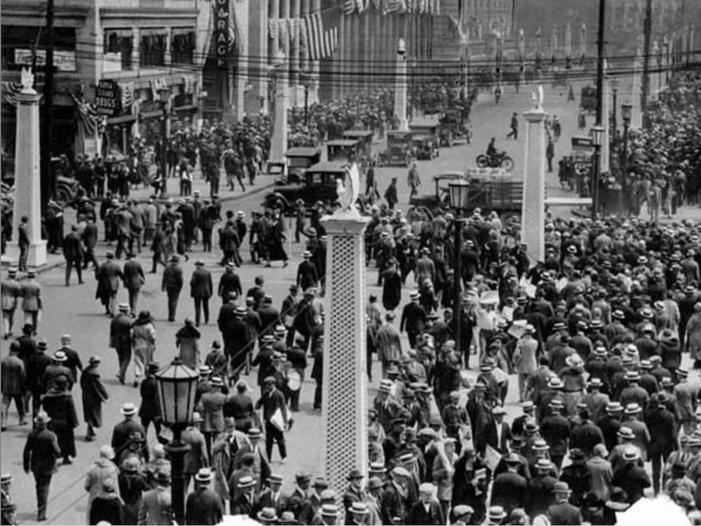 East 6th Street, from Superior to Lakeside, was lined with white pillars topped with eagles. Each eagle reportedly cost $400, a considerable sum in 1924. This photo of East 6th (facing south) shows those pillars, as well as men in straw hats milling about and Model-T cars proceeding cautiously through the crowd near Public Hall (not seen in this photo, but just to the right). | Date: June 11, 1924 | Source: Cleveland Memory Project, Cleveland State University Library Special CollectionsDownload Original File
