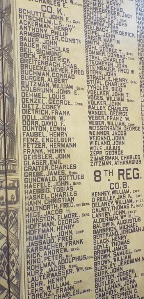 This is a partial listing from a wall plaque inside the Soldiers and Sailors Monument in Cleveland that depicts Company K of the 7th Ohio Volunteer Infantry unit during the Civil War. This was a German-American unit created when the entire Cleveland Turnverein membership enlisted in 1861. | Creator: Michael Barkacs | Date: August 2, 2016Download Original File