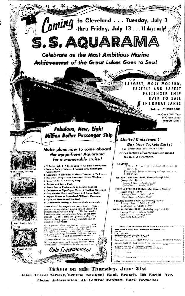 This advertisement called attention to the inaugural run of the ship between Cleveland and Detroit. Although the first season was limited to only 11 days in June and July, by 1957 the Aquarama operated more fully. | Date: June 18, 1956 | Source: Cleveland Plain DealerDownload Original File