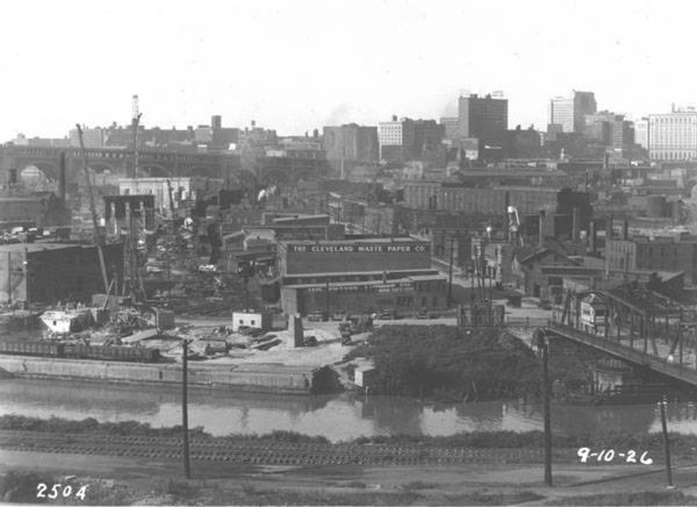 In this 1926 photograph, taken from the west bank of the Cuyahoga River, many factory and warehouse buildings can been seen covering what at one time was Cleveland Centre, its original radial street design no longer discernible. The Columbus Road Bridge appears on the right of the photo, as well as a good portion of Columbus Road itself. | Source: Cleveland State University, Michael Schwartz Library, Special CollectionsDownload Original File