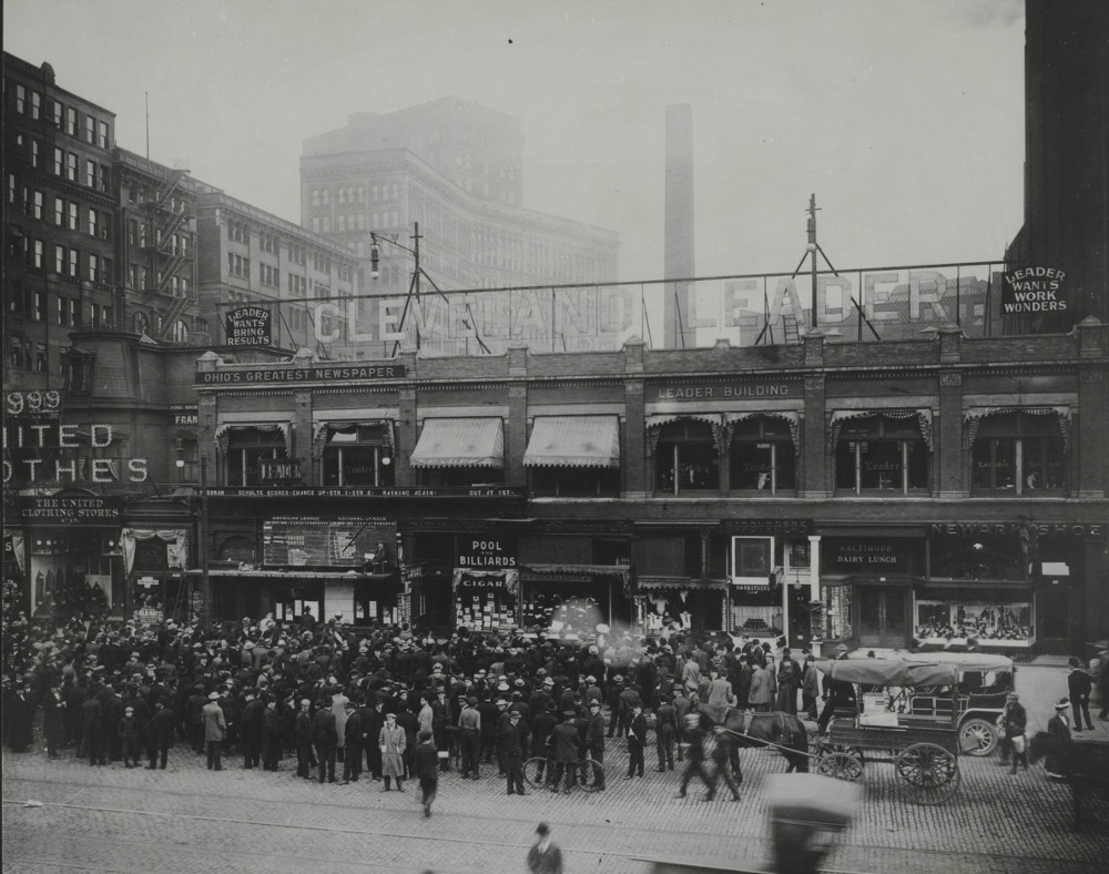 Erected in on the south side of Superior Avenue near Bond (East Sixth) Street in 1905 by Ralph King, a large downtown real estate developer and arts patron, the building was designed to be a temporary structure until a skyscraper could be designed and built on the site. The Cleveland Leader newspaper, and other tenants, occupied the building from 1905 until 1912, when it was torn down and the new 14-story Leader Building constructed. This photo was taken in circa 1905. | Creator: Cleveland Public Library, Digital GalleryDownload Original File