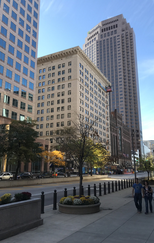 A view of the Leader Building from the north side of Superior Avenue looking west toward East Sixth Street and Public Square. While the 14-story Leader Building, when built, was the tallest building on the south side of Superior Avenue between Public Square and East Ninth Street, today it is dwarfed by two much taller nearby buildings--the 28-story Fifth Third Center (left) built in 1991 and the 45-story 200 Public Square Building (right) built in 1985. In 2016, the current owners of the building, K & D Properties, began converting the Leader Building into a mostly residential apartment building. | Creator: Jim DubelkoDownload Original File