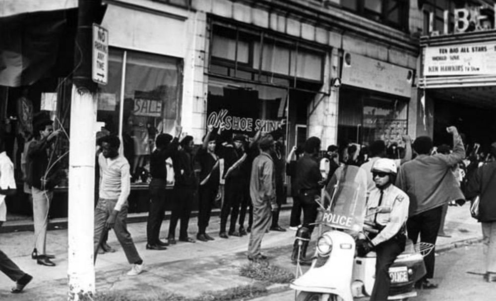 A different view of the movement, with the core of the protesters in a uniform harkening back to the Nationalist movement's more militant leanings. | Creator: Van Dillard | Date: October 5, 1968 | Source: Cleveland Memory Project, Cleveland State University Library Special CollectionsDownload Original File