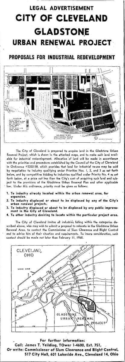 The City of Cleveland began actively recruiting prospective industries to relocate to the Gladstone renewal area in 1960, when the plan joined nearly 6,000 acres of other city land under federal urban renewal. Although urban renewal officials hoped to match suburban industrial parks, they soon learned that the higher cost per acre was unattractive to most industries. | Creator: City of Cleveland | Date: January 6, 1960 | Source: Cleveland Plain DealerDownload Original File