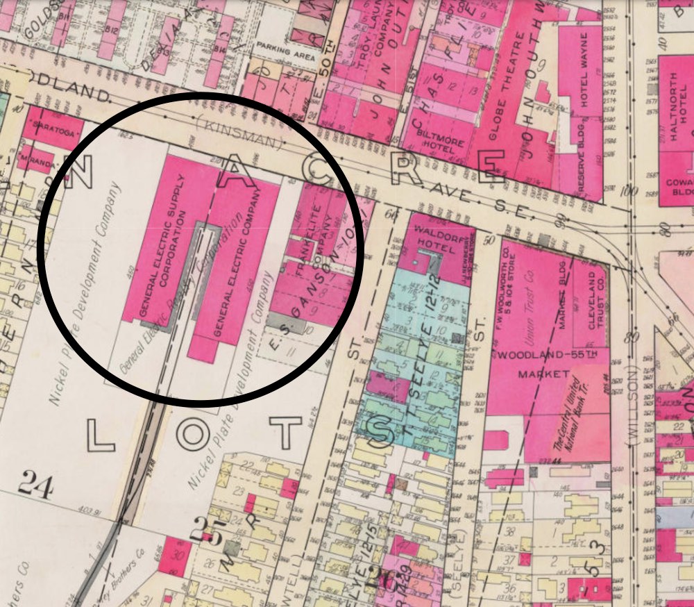 The General Electric Lamp Division warehouse and office building at 4966 Woodland Avenue, shown on this plat map, was built on what had previously been the front lawn of the Jewish Orphan Asylum. The GE building later became home to the Woodland Job Center, which grew out of a partnership between GE and the Cleveland school district. | Date: 1927 | Source: G. M. Hopkins, Plat Book of the City of Cleveland (Philadelphia, 1927).Download Original File