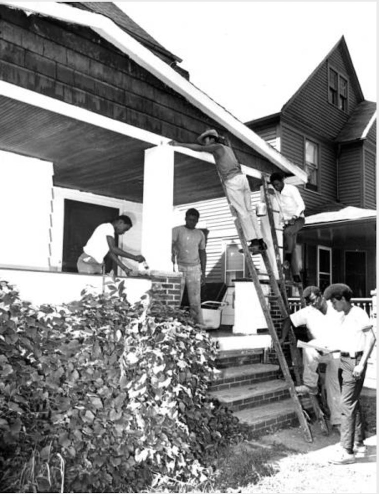A house being repaired as a part of a separate effort in the nearby Fairfax neighborhood. HOPE Inc. undertook similar work on houses it acquired in Hough. | Creator: Glenn Zahn | Date: August 22, 1969 | Source: Cleveland Memory, Cleveland State University Library Special CollectionsDownload Original File