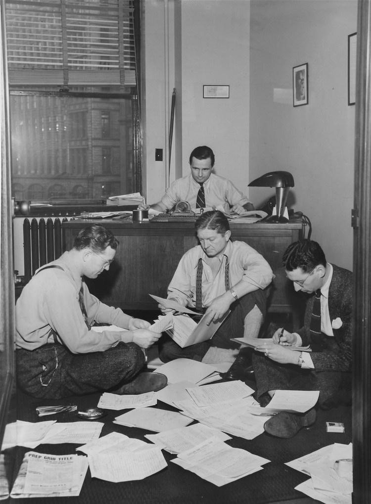In mid-December 1941, with their roster newly decimated by the entry of the U.S. to World War II, Rams executives gathered in their offices in Cleveland's Union Commerce Building (now the 925 Building) to review player scouting reports. From left: Earl “Dutch” Clark, head coach; Daniel F. Reeves (at desk), who had bought the team just seven months earlier; Charles “Chile” Walsh, assistant coach; and Manny Eisner, business manager.