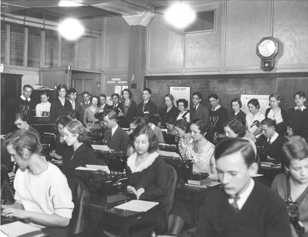 In the 1930s, classes were so crowded at West High that students often had to stand in classrooms. This 1932 photo shows a typewriting class with only enough seats for two-thirds of the attending students. Overcrowding was alleviated in 1937 with the construction of a four-story addition to the original West High school building. | Source: Cleveland State University, Michael Schwartz Library, Special CollectionsDownload Original File