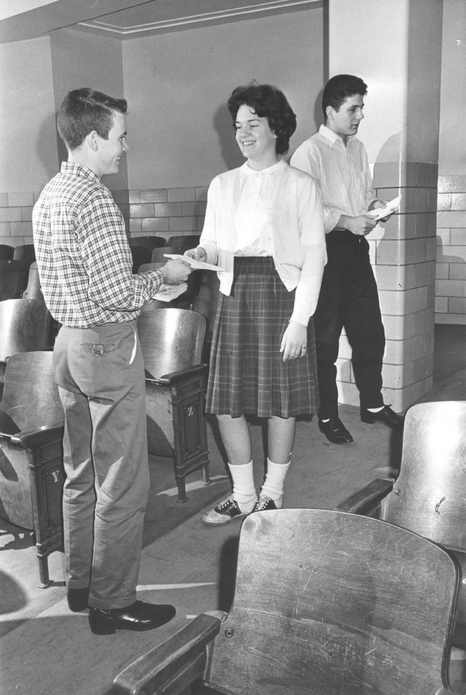 Key Club member Dennis Morgan offers a program booklet to 11th grader Greta Olsen for a play in the West High School auditorium on February 2, 1962. | Source: Cleveland State University, Michael Schwartz Library, Special CollectionsDownload Original File