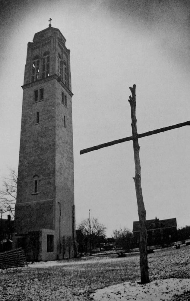 In 1975 St. Agnes was torn down due to deterioration. The bell tower remains today as result of a fundraising campaign. St. Agnes was designated as a sacred landmark in the mid-1970s, but failure to find alternative recourse after a grant of delay doomed the structure. | Creator: Don Emmerich and Father Edwin, S.T. | Date: 1980 | Source: "Trinity Missions: Missionary Servants of The Most Holy Trinity." The Cleveland Dioceses.Download Original File